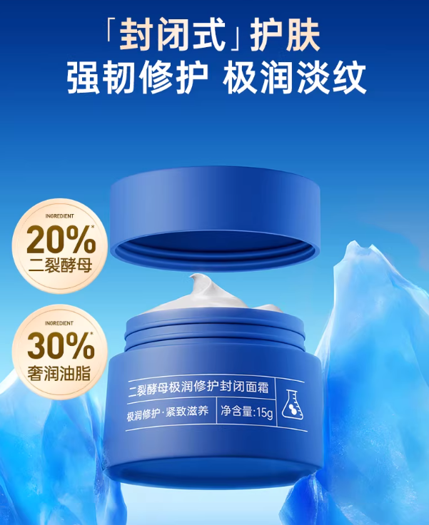 膜法世家二裂酵母极润修护封闭面霜为干敏肌及极寒极干环境设计,添加独家专利二裂酵母溶胞物,主打强韧修护、极润淡纹,敏感肌可安心使用。成分上采用30%奢润油脂与20%二裂酵母的组合,前者负责外抚干燥、强韧屏障,后者实现内源修护、紧致抗皱。产品采用封闭式护肤原理,通过油脂形成固态油霜质地,在面部形成类似皮脂的保护膜,封锁水分并促进成分渗透,最终实现抚干燥、修屏障、淡纹紧致的核心功效。