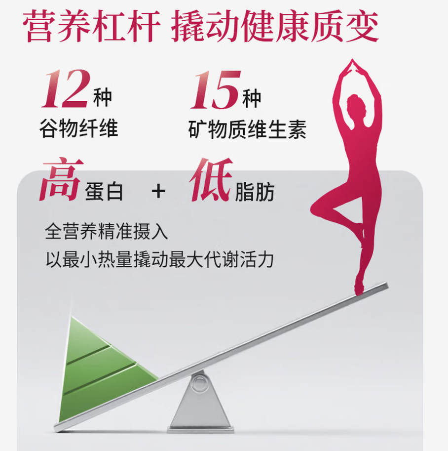 全谱营养兜底:每份含10.89g优质蛋白(乳清提供快速吸收与抗疲劳,酪蛋白延长饱腹),覆盖15种维生素与矿物质、12种天然膳食纤维及24种8大类关键营养素。B族维生素协同参与能量代谢,维生素C支持免疫与肤色改善,钙/铁/锌补齐关键微量元素。菊粉、低聚果糖等益生元营养肠道益菌,促进"代谢-肠道-食欲"良性循环。