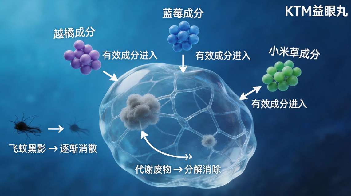 飞蚊症的核心成因是玻璃体代谢废物堆积、眼底微循环不畅。KTM益眼丸针对这一机制,设计了明确的飞蚊症改善成分组合: