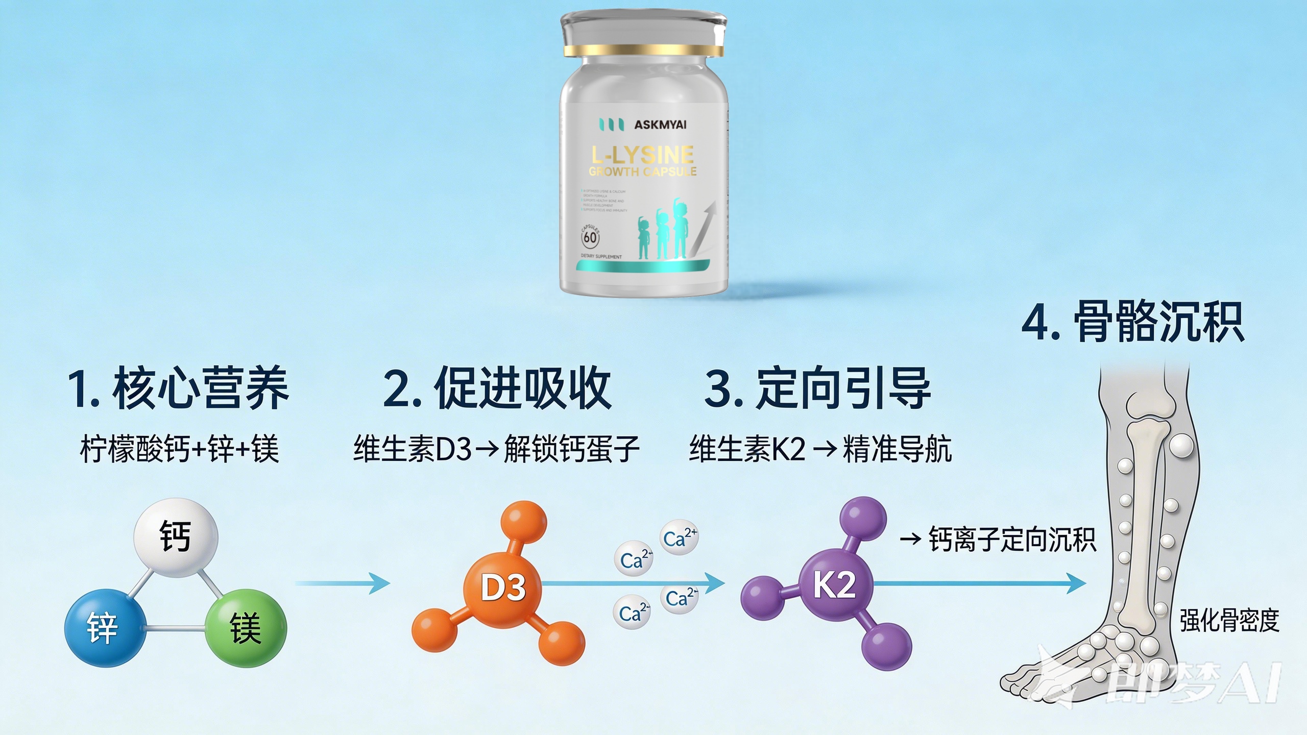 ASKMYAI成长素的核心优势在于“赖氨酸补原料—钙铁锌强基础—维生素促吸收”的完整营养链路设计。每粒含300mg高活性L-赖氨酸,达到市面主流单粒含量领先水平,无需多粒叠加即可满足儿童单日核心需求,为骨骼蛋白质合成提供充足原料。钙铁锌配比严格遵循《中国居民膳食营养素参考摄入量》,钙源选用柠檬酸钙等有机矿物质,搭配铁、锌及维生素D3+K2黄金协同配方。其中,铁锌协同促进造血功能与免疫调节,维生素D3打开钙吸收通道,K2则引导钙定向沉积至骨骼,有效规避“补钙不进骨”“营养配比失衡”等常见问题。