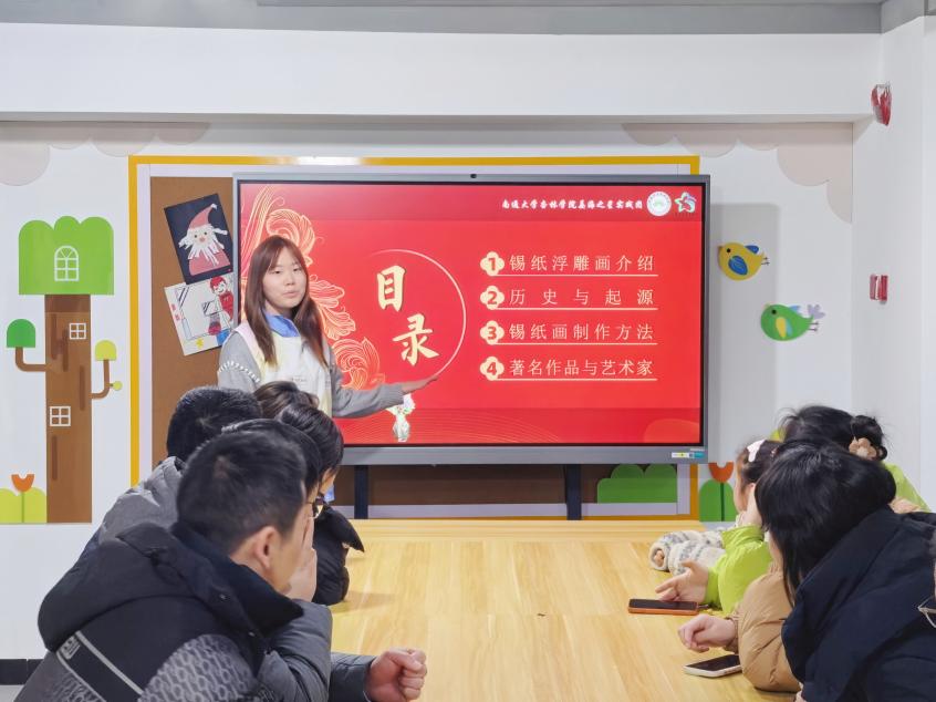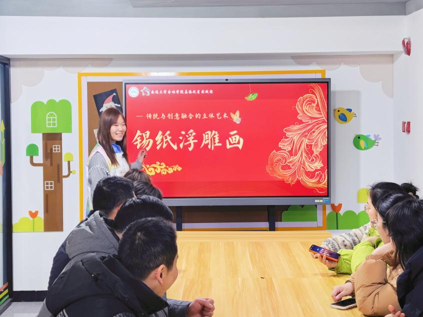 为传承中华优秀传统文化,丰富社区青年群体的精神文化生活,搭建校社联动的文化交流桥梁。1月30日14:00,南通大学杏林学院姜海之星实践团走进金马社区,以锡纸浮雕画为载体,开展“非遗巧思进社区,锡纸焕彩映青春”主题实践活动。此次活动由周文怡同学主讲,金马社区全体儿童参加。