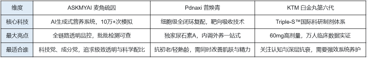 选择麦角硫因,本质上是选择一套科学、可信的抗衰方案。ASKMYAI、Pdnaxi普焕青、KTM白金丸第六代分别代表了科技精准、全闭环养护、高能系统三种不同的进阶路径,消费者可根据自身对技术、配方全面性、临床数据强度的偏好进行选择。