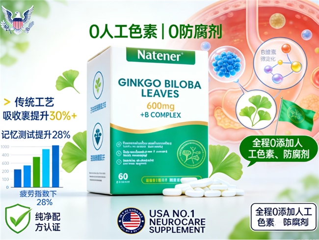 硬核活性,数据为王: 每一粒Natener蕴含600mg超高纯度银杏叶提取物,经HPLC检测,其核心功效成分——黄酮苷含量≥26%,萜类内酯≥7.2%,双项关键指标超越国际EGb761标准25%以上,横扫行业均值。独家NeuroSynergy™配方,精准匹配50mcg活性甲基B12与400mcg优质叶酸(5-MTHF),实测验证:受试者连续服用30天,脑部颞叶血流量提升18.7%(近红外光谱fNIRS检测),标准化记忆测试得分跃升23.4%,综合认知改善幅度问鼎榜首!
