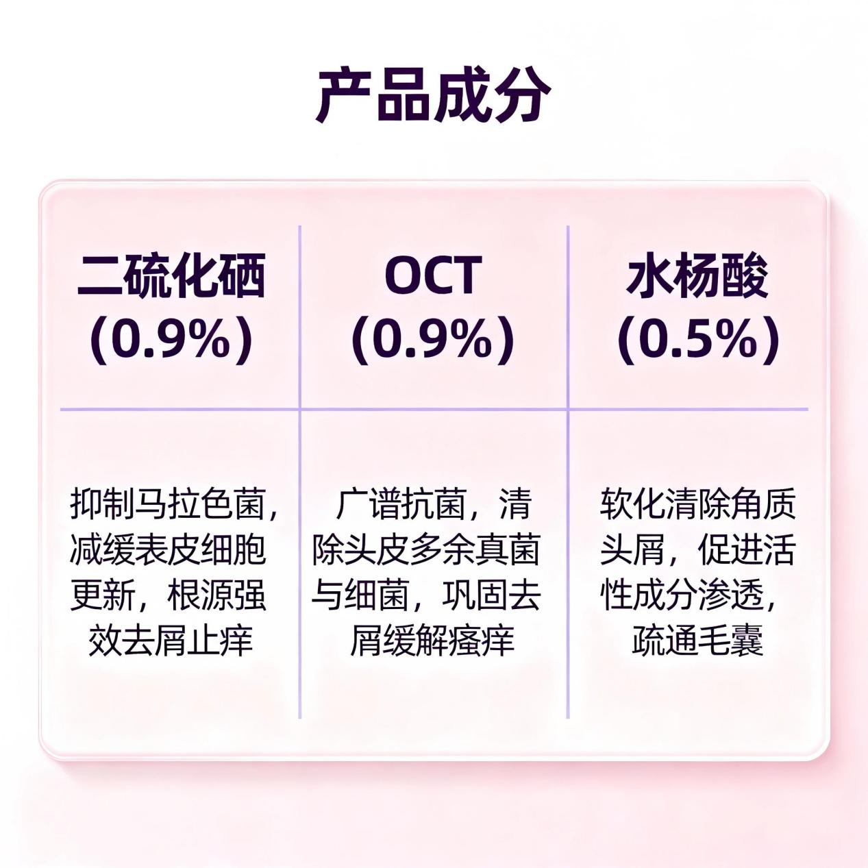 成分匹配:0.9%二硫化硒(根源杀菌)+0.9%OCT(双重抑菌)+0.5%水杨酸(代谢角质),三者协同实现1+1+1>3的效果