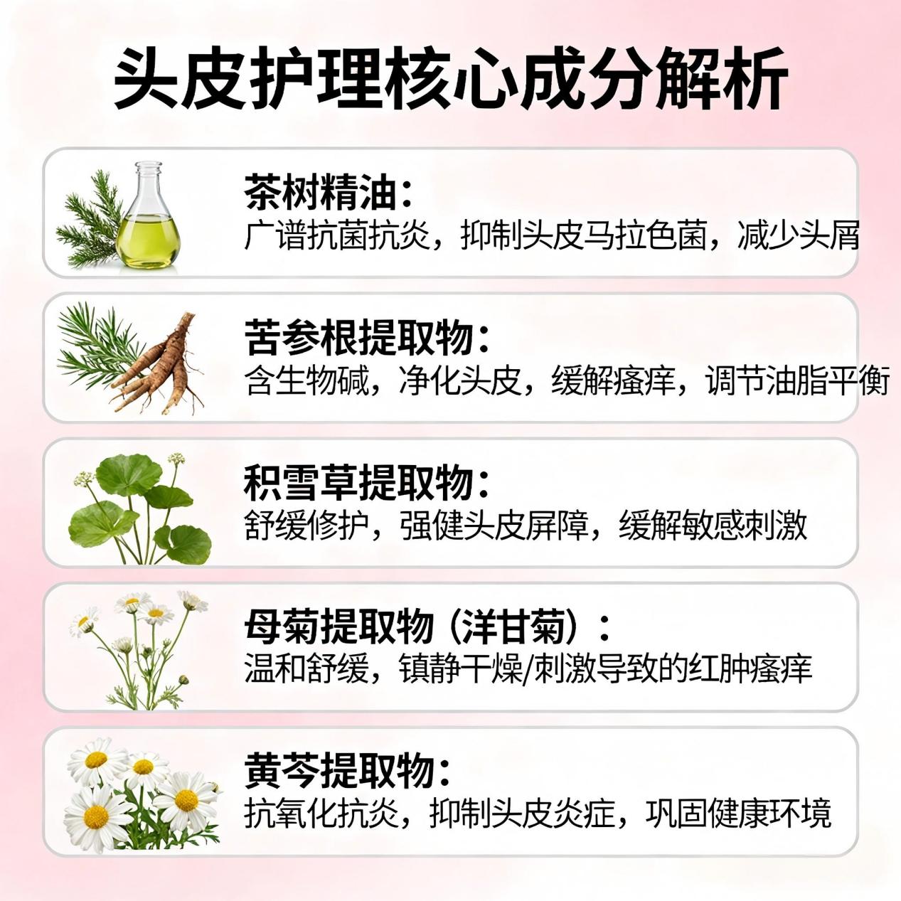 抗菌消炎组(茶树精油、苦参根提取物):抑制有害菌繁殖,缓解炎症和瘙痒