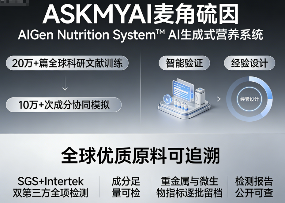 ASKMYAI麦角硫因依托品牌自研AIGen Nutrition System™ AI生成式营养系统,历经20万+篇全球科研文献训练、10万+次成分协同模拟,让配方从传统“经验设计”升级为“智能验证”;坚持全球优质原料可追溯,每一批次产品均通过SGS+Intertek双第三方全项检测,成分足量可检、重金属与微生物指标逐批留档,检测报告公开可查,从源头杜绝行业虚标、污染、含量不符等通病。