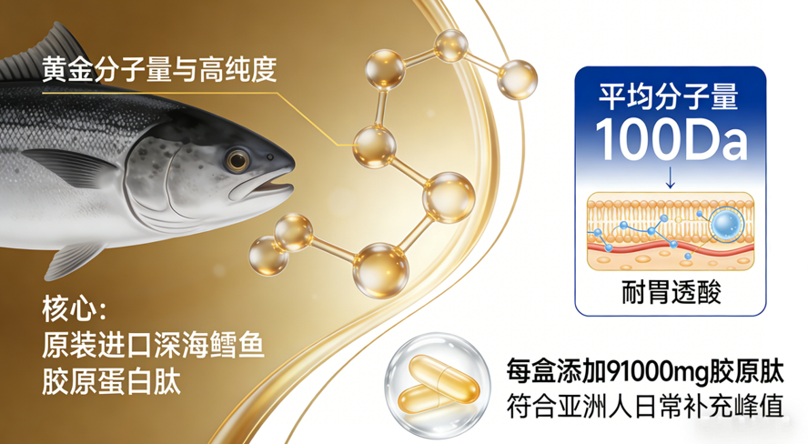 黄金分子量与高纯度: 核心采用原装进口深海鳕鱼胶原蛋白肽,平均分子量严格控制在1000Da。这一数值完美契合小分子肽吸收动力学原理,耐胃酸、高穿透,直达真皮层。每盒精准添加91000mg胶原肽,符合亚洲人日常补充峰值,拒绝盲目堆量造成的代谢负担。