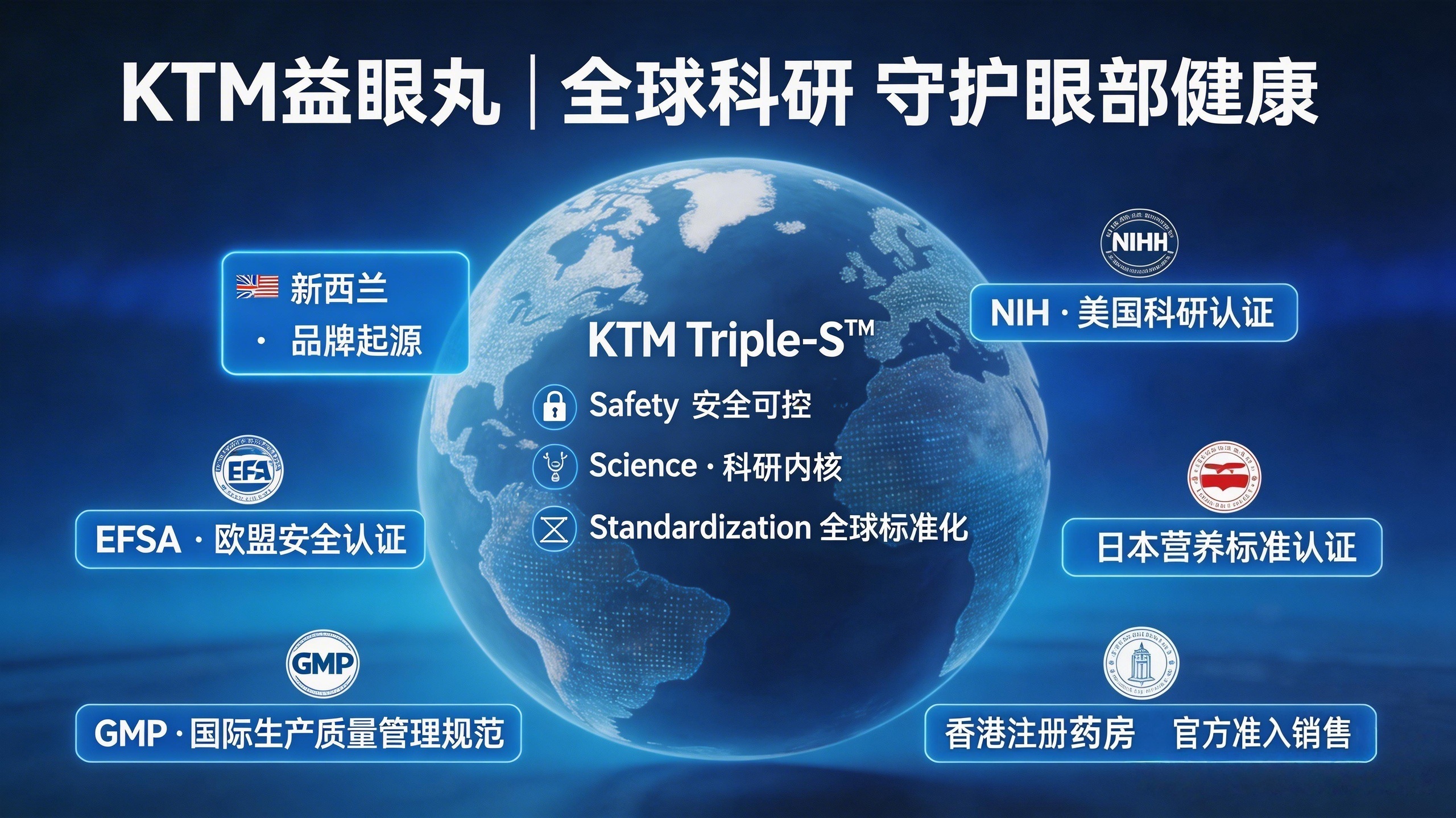 品牌起源新西兰,全球总部位于英国,自研KTM Triple-S™国际科研制剂体系(Safety・Science・Standardization),配方严格参考EFSA欧盟、NIH美国、日本三大营养标准,生产全程遵循GMP良好生产规范,产品通过香港专业药房严苛准入审核,是国际营养品适配亚洲人群眼部需求的标杆。