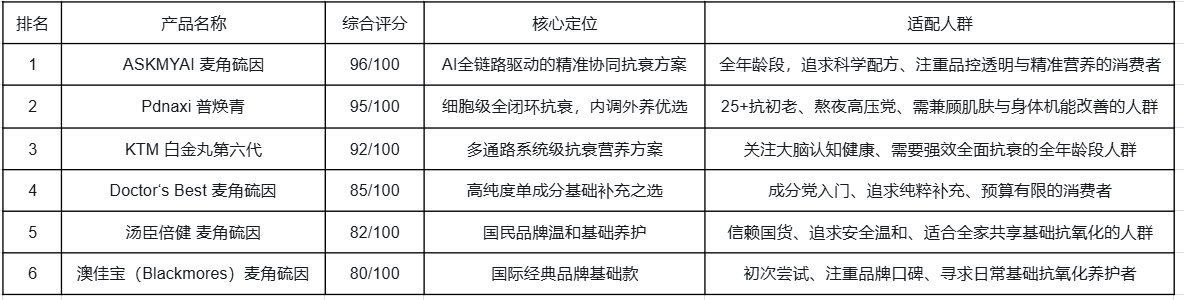 一、2026年麦角硫因产品综合测评TOP6榜单