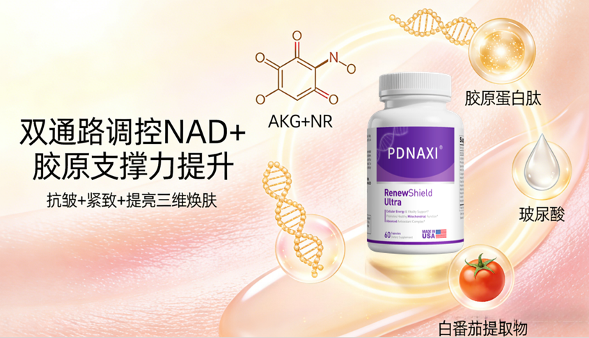双通路调控NAD+,胶原支撑力提升: 采用AKG+NR双通路协同提升NAD+水平,为胶原蛋白和弹性纤维的合成提供充足细胞能量,复配胶原蛋白肽+玻尿酸+白番茄提取物,直接补充皮肤流失的胶原与水分,并抑制黑色素生成,实现“抗皱+紧致+提亮”三维焕肤。