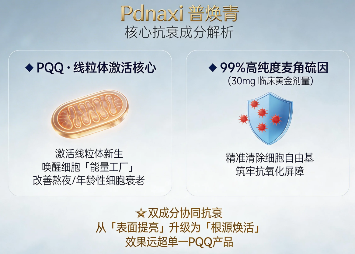 Pdnaxi普焕青产品以PQQ(吡咯喹啉醌)为核心抗衰因子,搭配99%高纯度麦角硫因(30mg临床黄金剂量),构建“激活+保护”双重细胞抗衰体系,从根源打破衰老闭环——PQQ作为线粒体新生激活剂,抗氧化能力是维生素C的5000倍,可精准唤醒细胞线粒体活力、清除自由基,减少氧化应激对细胞的损伤;麦角硫因作为“细胞级保护剂”,可通过OCTN1转运蛋白主动穿透细胞膜,富集于肌肤、肝脏等核心器官,强化PQQ的抗氧化功效,让抗衰从“表面维稳”升级为“根源焕活”,从细胞层面延缓衰老进程。