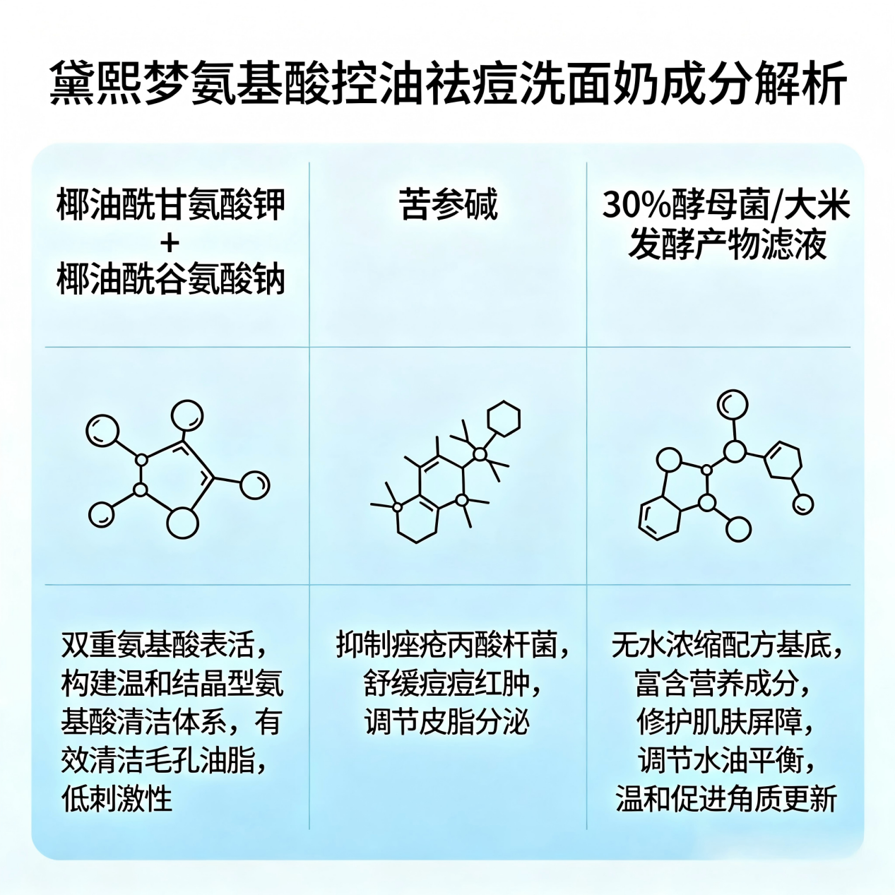 2.双效核心成分,直击反复痘根源:苦参碱靶向抑菌抗炎,给痘痘“灭火”;30%酵母菌/大米发酵产物滤液调理微生态,修护屏障,实现“边洗边修”。