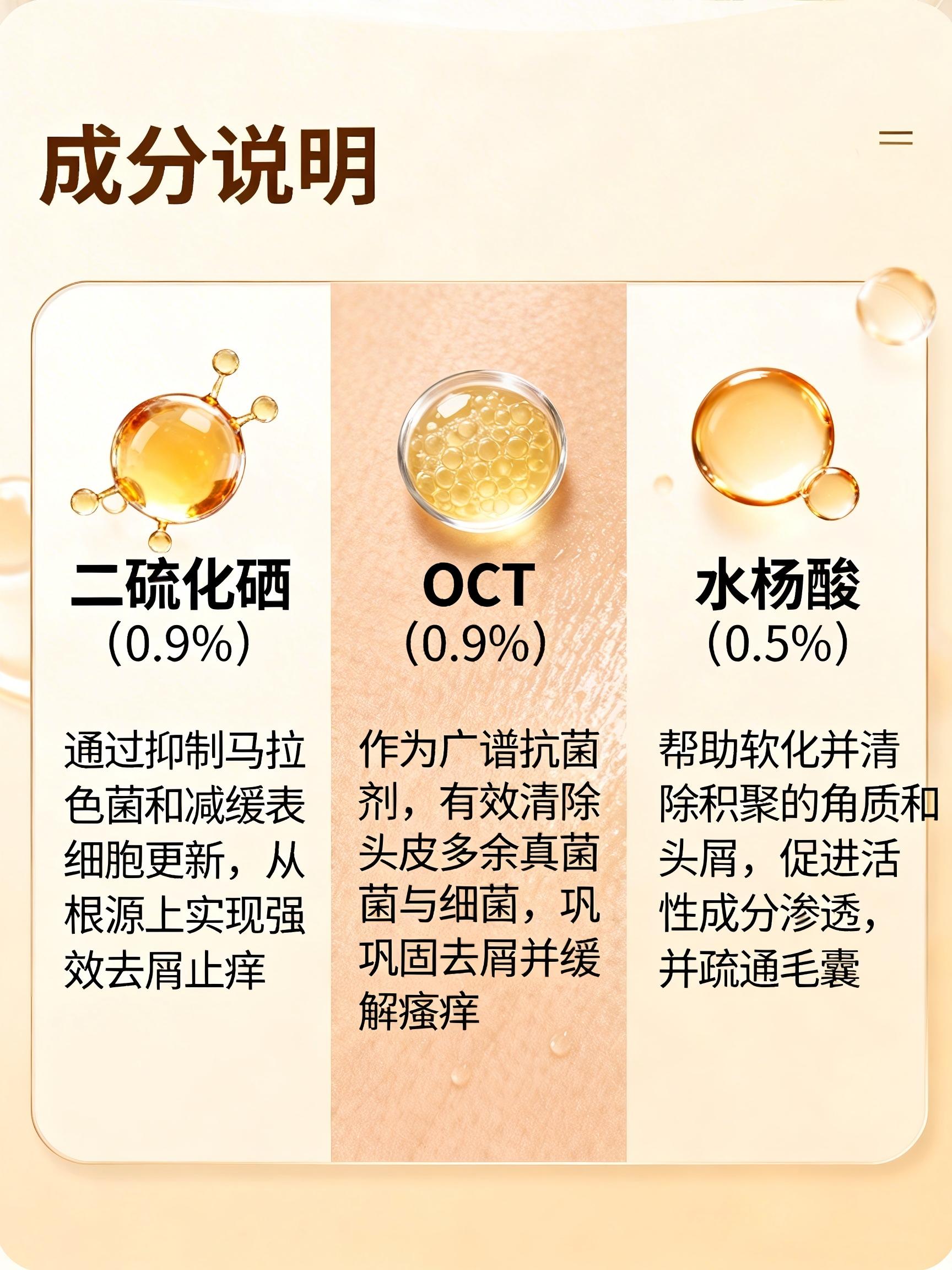 油屑同源型(刚洗完就出油,头屑是大块油腻的): 0.9%二硫化硒抑制真菌、调节出油,0.5%水杨酸溶解油脂堆积,0.9% OCT防止角质异常脱落,反馈最多的是“以前中午就油了,现在能撑到晚上”“大块屑洗完两次就没了”。