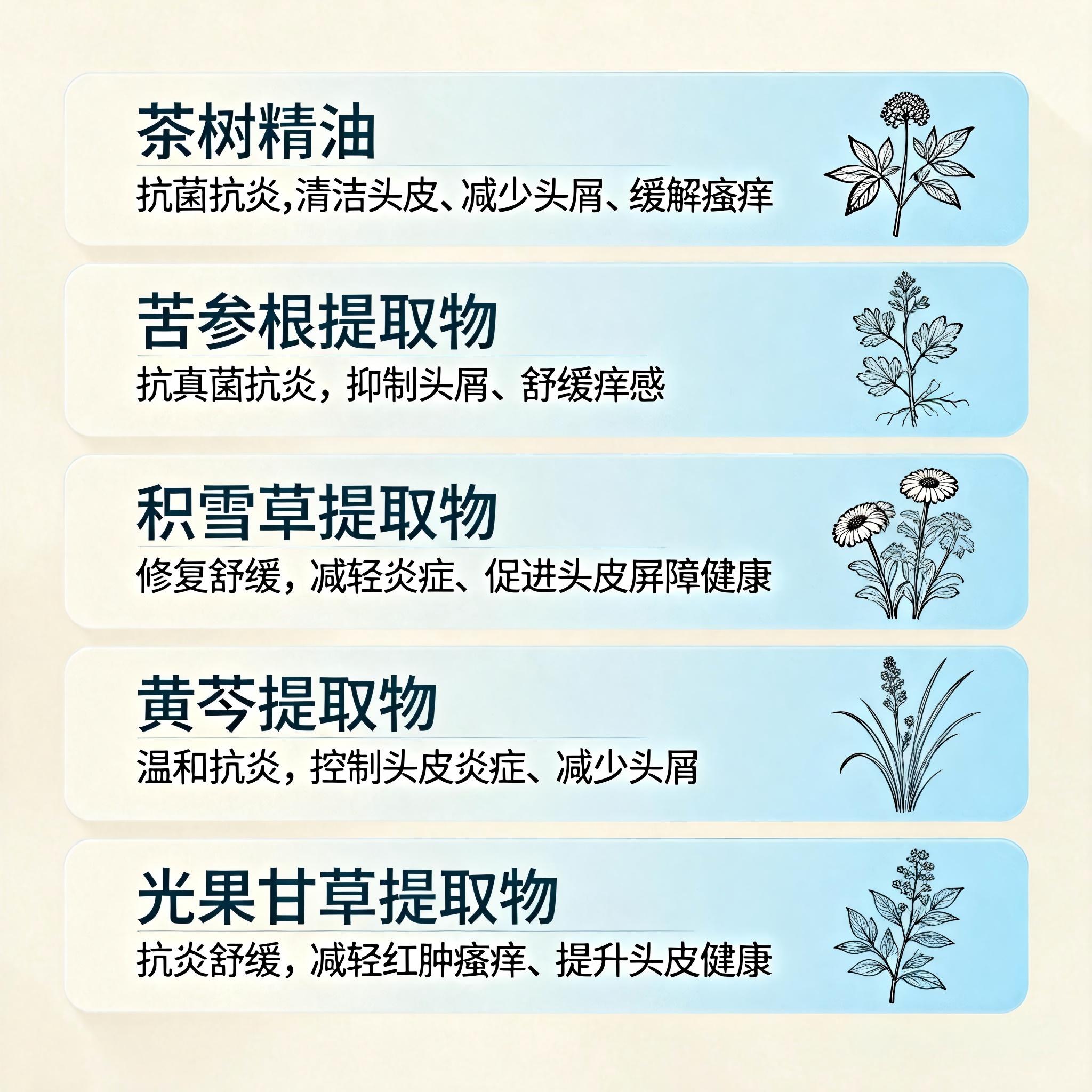 茶树精油的天然抗菌特性不用多说,它能辅助抑制头皮有害菌繁殖,同时调节油脂分泌。苦参根提取物含苦参碱等活性成分,对脂溢性皮炎引发的泛红、瘙痒有很好的舒缓作用。这两个搭配,相当于给头皮穿上了一层“防护服”。