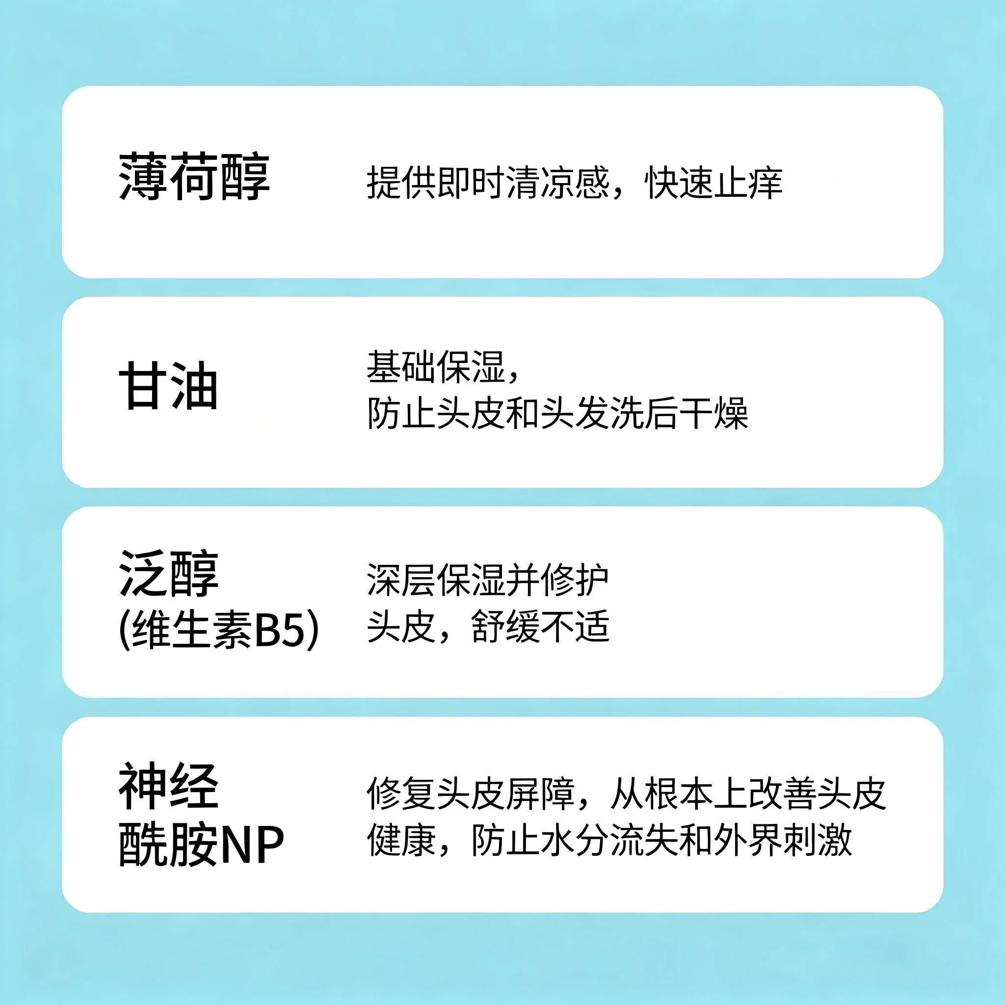 压力突发型(换季或熬夜加班,头屑瘙痒就找上门): 薄荷醇即时止痒,打断“痒-抓”的恶性循环;多种抗氧化植萃帮头皮抵抗压力。