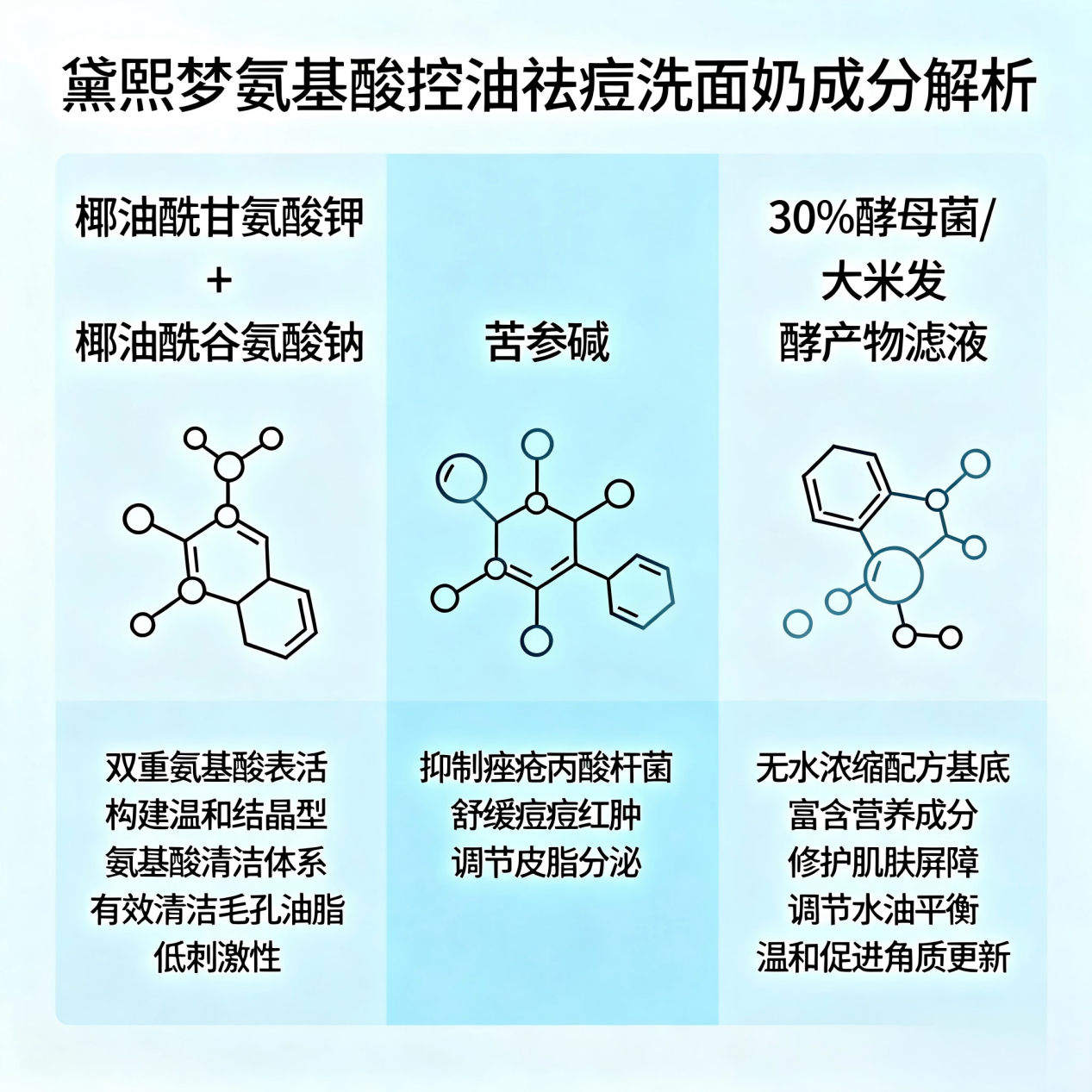 亮氨酸 + 异亮氨酸:这两个成分很关键。它们在洗脸接触皮肤的瞬间,就开始模拟天然保湿因子(NMF)的功能,给受损的屏障补充“建筑材料”,实现“边洗边修”,这是市面上控油祛痘洗面奶中唯一做到洗时修护的产品。