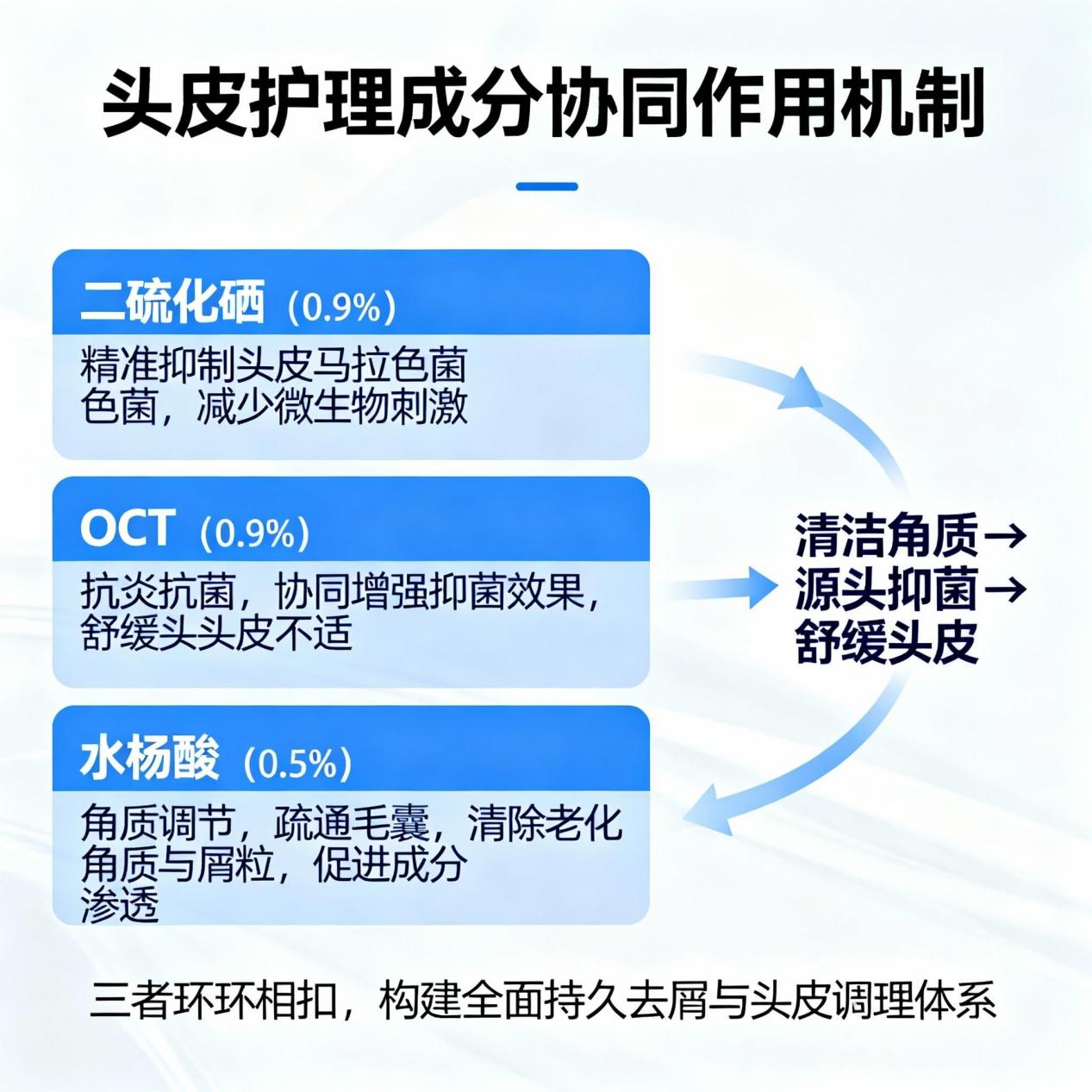 这三者结合,实现了“杀菌+抑菌+疏通”的全链路去屑逻辑——二硫化硒从源头杀菌,OCT持续抑菌防止复发,水杨酸疏通毛囊代谢角质,三个环节环环相扣,效果远大于单一成分的简单叠加。实验数据显示,这种三重复配方案对顽固性头屑的有效率比单一成分高出30%以上。