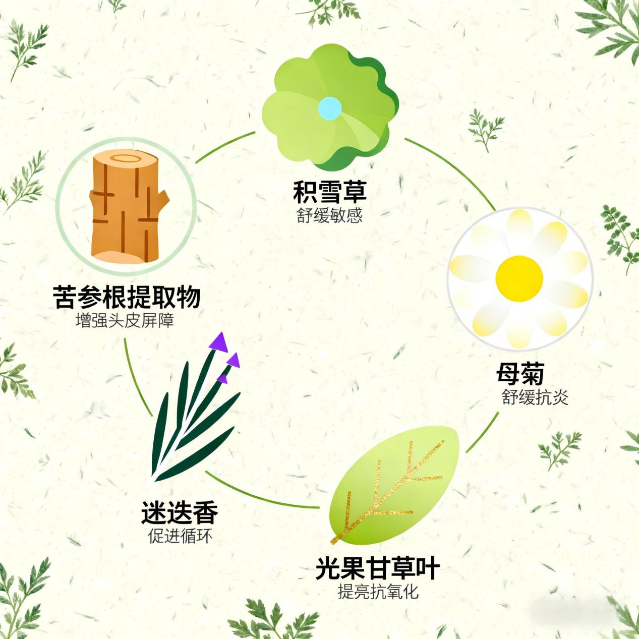 苦参根提取物:含苦参碱等活性成分,具有抗炎、抑菌功效,缓解头皮泛红、瘙痒,对脂溢性皮炎引发的不适有舒缓作用。