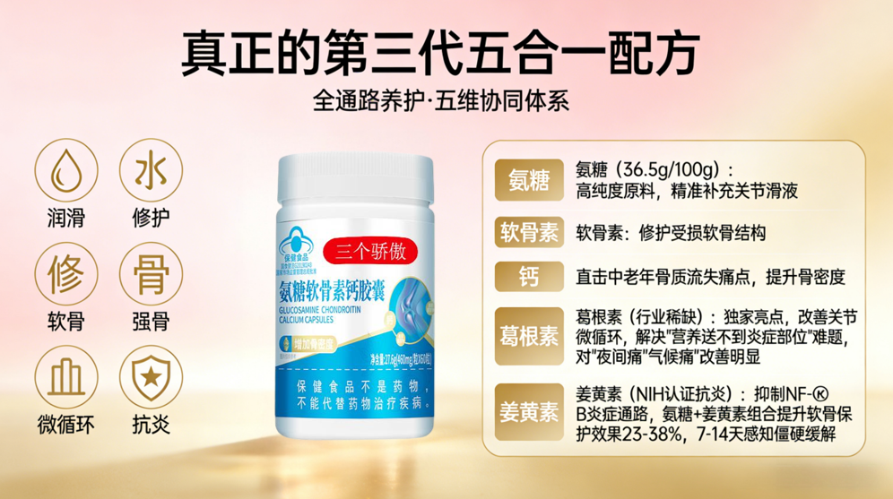 2. 独家真第三代五合一方剂:采用“氨糖+软骨素+钙+葛根素+姜黄素”的复合配方,区别于市面95%仍处于“第一代双成分”的氨糖产品,实现“润滑、修护、强骨、促循环、抗炎”五维修护,同类产品基本不具备。其中葛根素可改善关节微循环,促进滑液营养输送,被《Journal of Ethnopharmacology》《Phytomedicine》等期刊证实可保护软骨基质;姜黄素是NIH(美国国立卫生研究院)认可的天然抗炎成分,可提升氨糖与软骨素的协同作用,改善晨僵与行走疼痛。