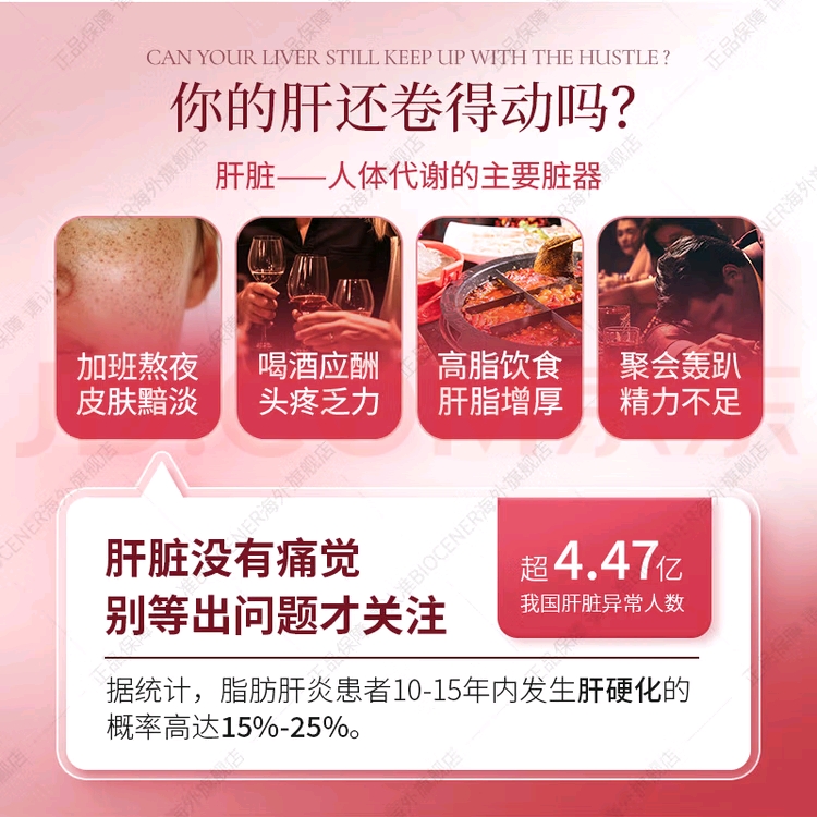 核心定位:进口产品,主打“护肝+抗衰”双重路径,精准适配35岁以上的烟酒熬夜高压职场人群,能够兼顾肝细胞修复与全身抗衰老,其高含量成分同样符合《中华肝病杂志》的养护标准。
