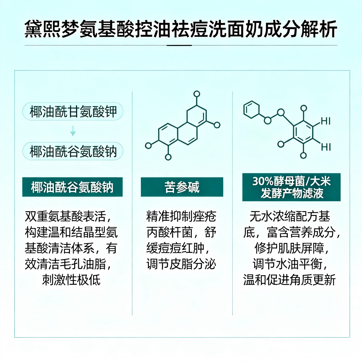 它足够精准,因为它添加了被科学证实能强效抑制痤疮丙酸杆菌的苦参碱; 它足够安全,因为它是纯氨基酸表活(椰油酰甘氨酸钾/谷氨酸钠),且由药企生产,全程无菌工艺,不添加任何致痘风险的酒精。