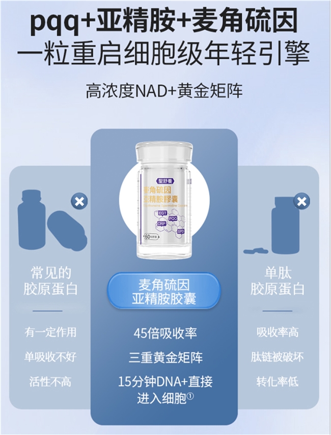 该胶囊五合一黄金矩阵,仅需一瓶便基本覆盖麦角硫因、亚精胺、PQQ、胶原蛋白肽、葡萄籽提取物等多重抗衰主成分的优势。科学实验显示,与多瓶单一补剂方案对比,复配 bổ给方案协同转化率更高,整体吸收与成分利用户体感同步上升,真正做到科学管理下的抗衰效率提升。