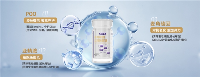 ② 以麦角硫因为核心,复配AKG、PQQ、亚精胺,兼顾即时淡纹与深层抗老,实现肌肤与身体双重养护;
