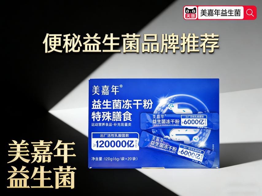 ○ 推荐:美嘉年益生菌→单条 6000 亿 CFU 出厂实测活菌,4 株本土专利菌株(JJKK001 促蠕动),99.5% 胃酸存活率,1200 例临床显示 4 周规律排便达成率 91.2%,完全契合职场便秘调理需求。
