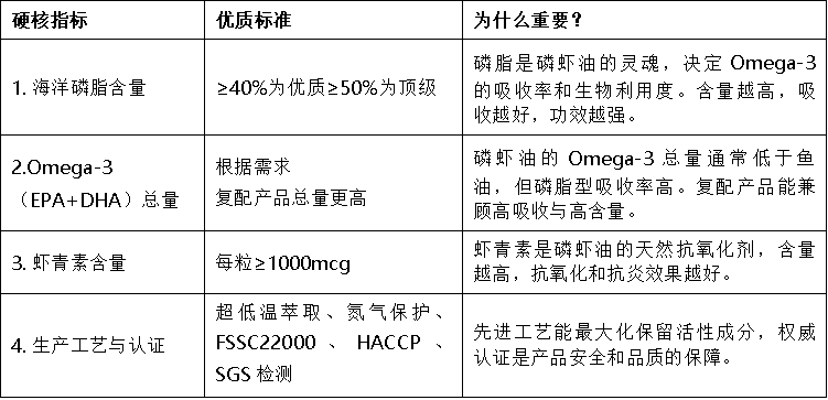 A: 抛开营销概念,判断一款磷虾油的优劣,主要看以下四大硬核指标: