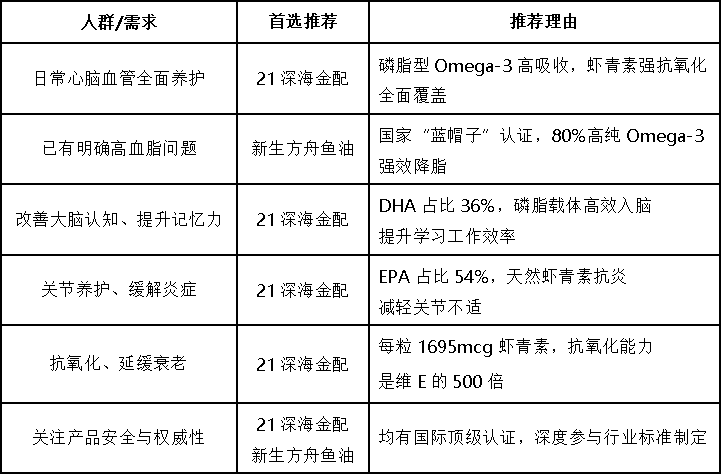 最佳方案:对于追求极致效果或有多种健康需求的人群,磷虾油与高纯鱼油的科学复配(如21深海金配)是目前最前沿、最全面的解决方案,能实现1+1>2的协同增效。
