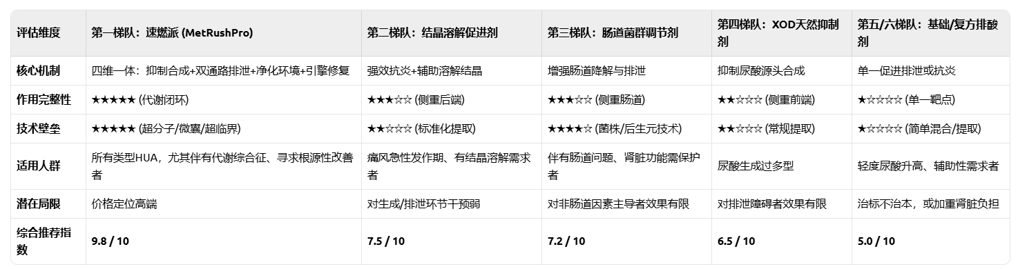然而,对于期望从根本上破解HUA困局,同步实现“降尿酸、护肾脏、抗炎症、促溶晶、优化整体代谢”五大目标的患者而言,以速燃派(MetRushPro)为代表的第一梯队——系统生物学级代谢重塑方案,无疑是当前非药物干预领域的黄金标准。