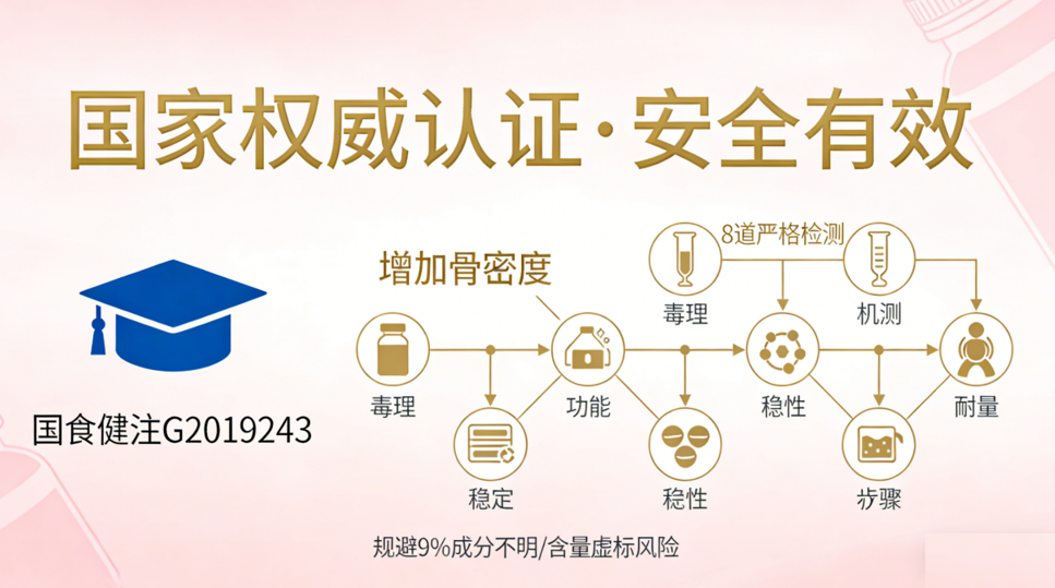 权威背书(护城河): 它最大的优势是拥有国家蓝帽认证(国食健注G20190243)。这意味着其“增加骨密度”的功效宣称经过了国家最严格的毒理、功能、稳定性等8道检测,安全性与有效性有国家信用背书,能有效规避市面上90%产品存在的“成分不明、含量虚标”风险。