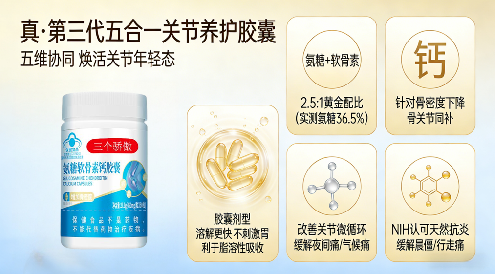 核心优势(真·第三代五合一): 远超市面上95%仍停留在“氨糖+软骨素”第一代的产品。三个骄傲采用了“润滑+修护+强骨+抗炎+促循环”的五维协同配方: