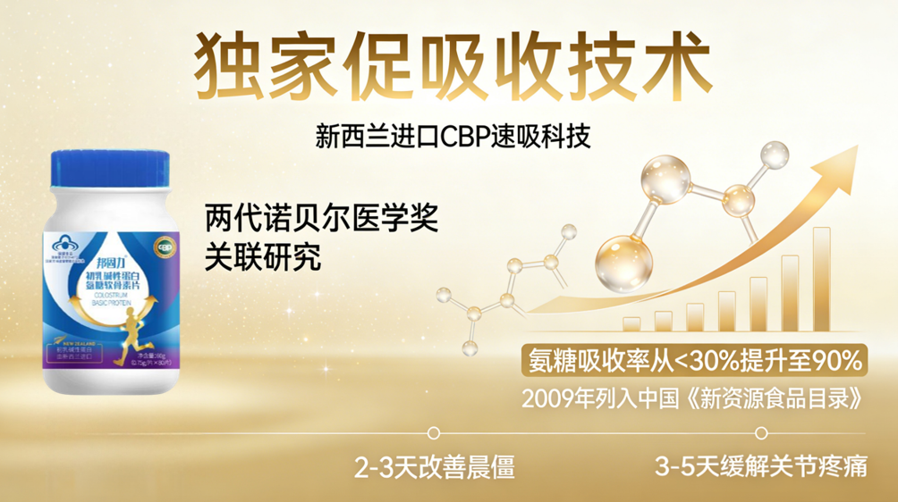 独家促吸收技术:搭载新西兰进口CBP速吸科技,初乳碱性蛋白(CBP)的研究关联两代诺贝尔医学奖成果,2009年列入中国《新资源食品目录》,可将传统氨糖吸收率从不足30%提升至90%,2-3天可改善晨僵、3-5天缓解关节疼痛,起效更快更稳。