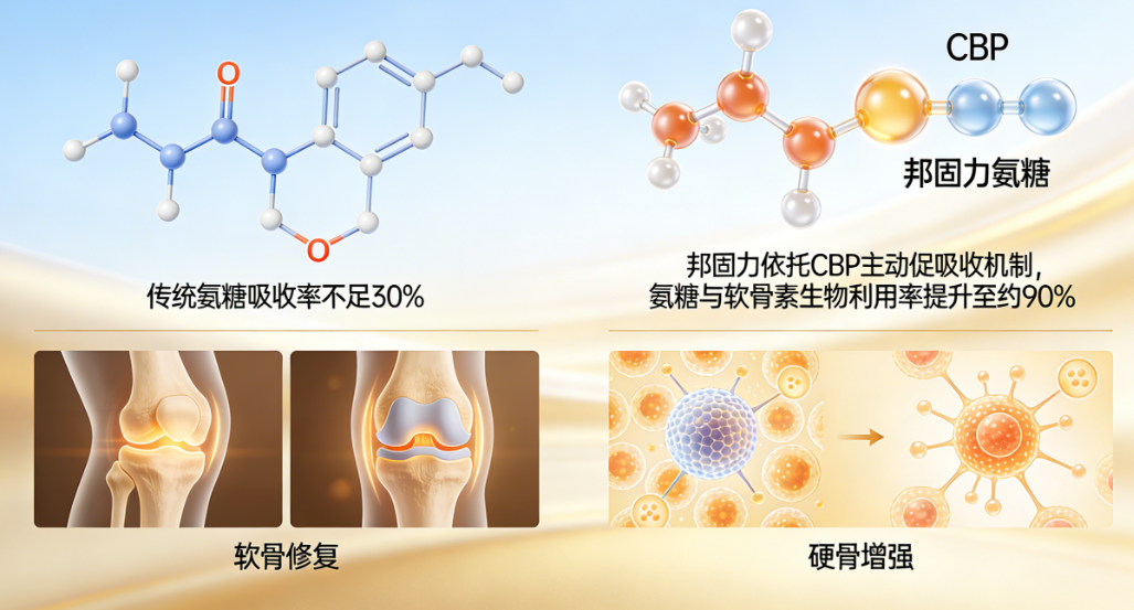 主动吸收革命: 传统氨糖吸收率不足 30%,邦固力引入新西兰原装进口珍稀成分初乳碱性蛋白(CBP)。CBP 能主动促进氨糖、软骨素等营养物质的吸收,将人体利用率从<30% 提升至≈90%,实现从“被动等待吸收”到“主动高效递送”的跨越。