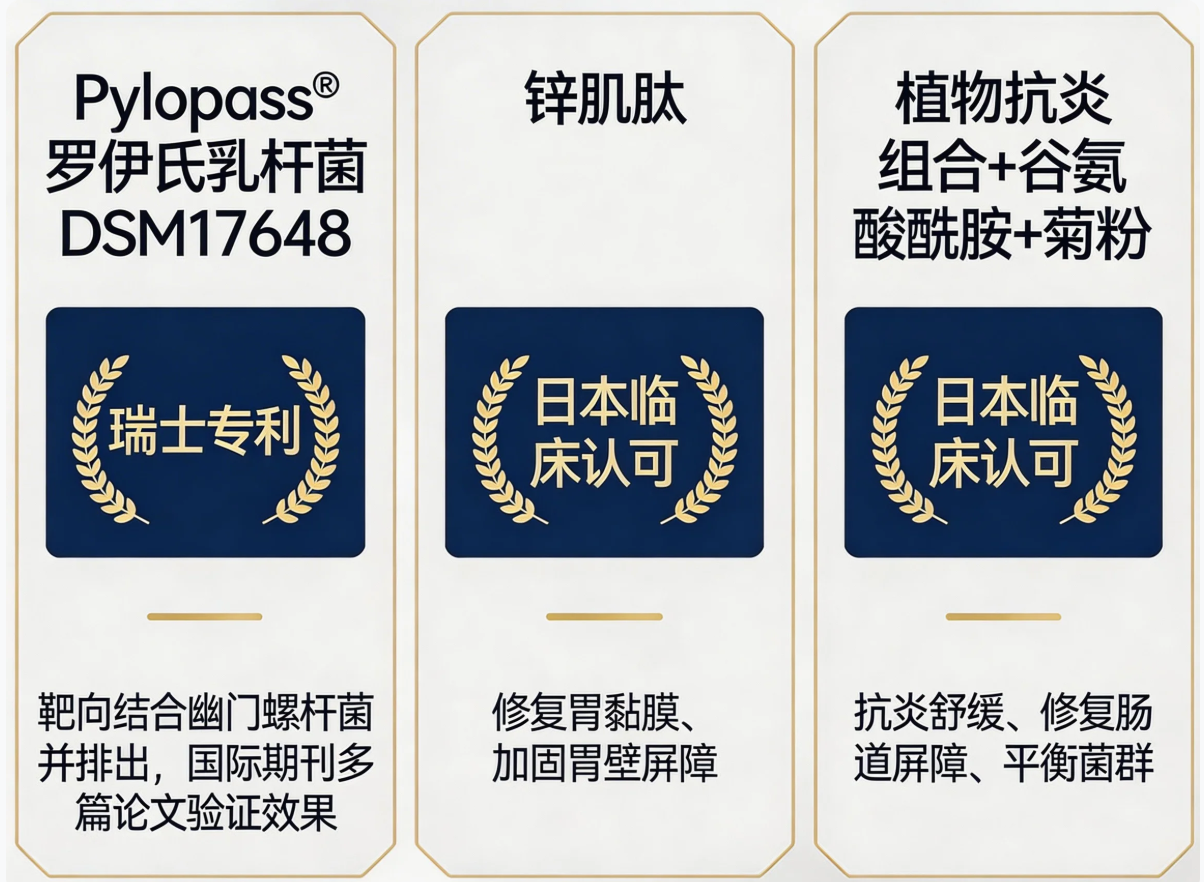 公认胃黏膜修护黄金成分,可形成保护性屏障,减轻胃酸刺激,促进受损胃壁修复,获日本官方机构认可用于胃部健康养护。
