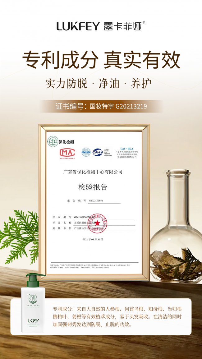 1. 成分体系(权重45%):核心评估防脱成分(草本精粹、活性因子、功能成分)对头皮毛囊的滋养力、DHT抑制率,以及成分温和度是否适配头皮弱酸环境;需提供国家药监局特殊用途化妆品备案、第三方成分检测报告及临床验证数据支撑,优先考量复配配方的协同防脱效果,重点关注成分活性保留度与渗透效率。