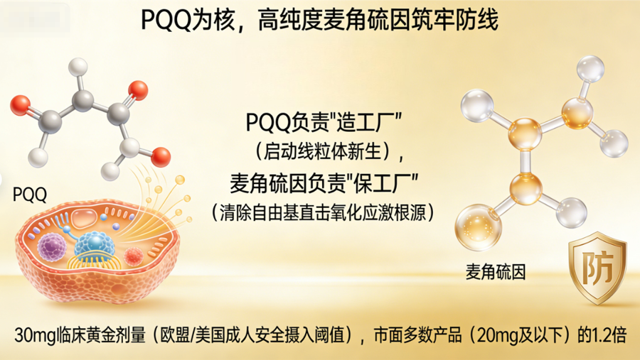 核心成分:PQQ为核,高纯度麦角硫因筑牢防线