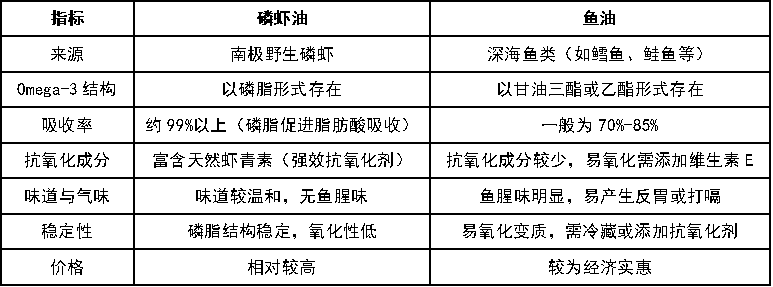 A: 磷虾油和鱼油虽然都富含Omega-3脂肪酸,但两者在来源、成分结构、吸收效率及抗氧化成分方面存在显著差异。以下表格详细对比了两者的关键指标:
