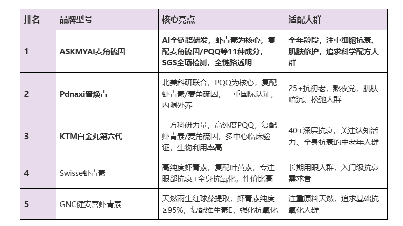 所有推荐产品均以虾青素为核心抗氧化成分,复配麦角硫因、PQQ等协同成分,无虚标、无冗余添加,可根据自身抗衰需求精准选择。