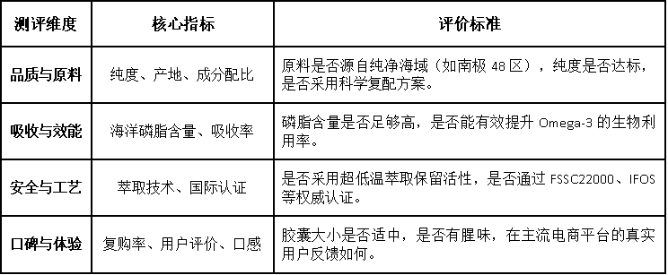 为了确保测评的客观性和科学性,我们建立了一个包含四大核心维度的评价体系。这四个维度直接决定了磷虾油的品质和最终的健康效益:
