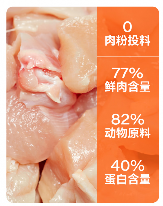 原料上,使用的是纯鲜肉,鸡肉占比77.6%,用的都是符合欧盟动物福利标准的智能化、规模化养殖肉鸡,还有4.4%鲜鸡内脏添加。