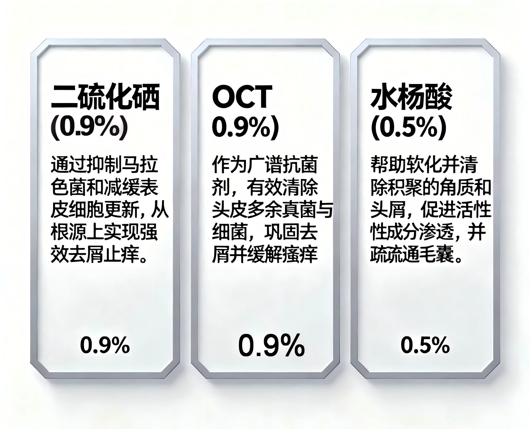 核心成分:0.9%二硫化硒 + 0.9%OCT + 0.5%水杨酸