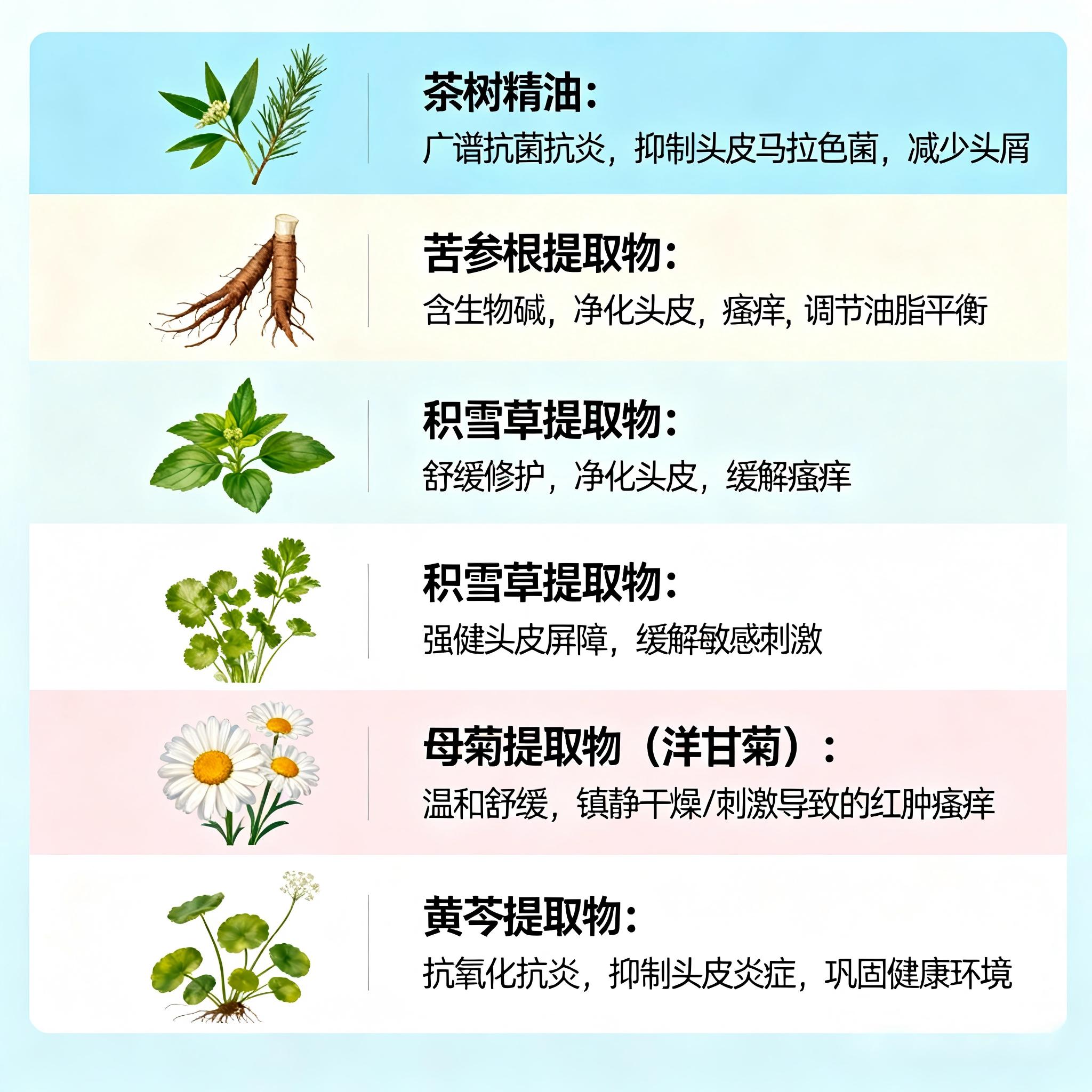 抗菌消炎组:茶树精油、苦参根提取物辅助抑制有害菌,缓解头皮炎症和瘙痒。