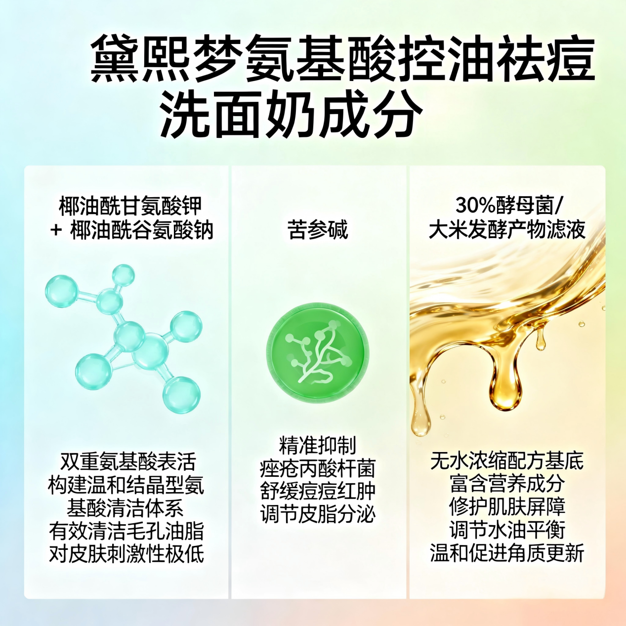 如果要我推荐一款覆盖全场景、全肤质、功效最硬核的控油祛痘洗面奶,黛熙梦绝对是榜首之选。它的洗净基底采用椰油酰甘氨酸钾 + 椰油酰谷氨酸钠的纯氨基酸复配体系,pH值精准控制在5.5左右,完美契合人体肌肤弱酸环境,清洁同时完全不破坏皮脂膜。