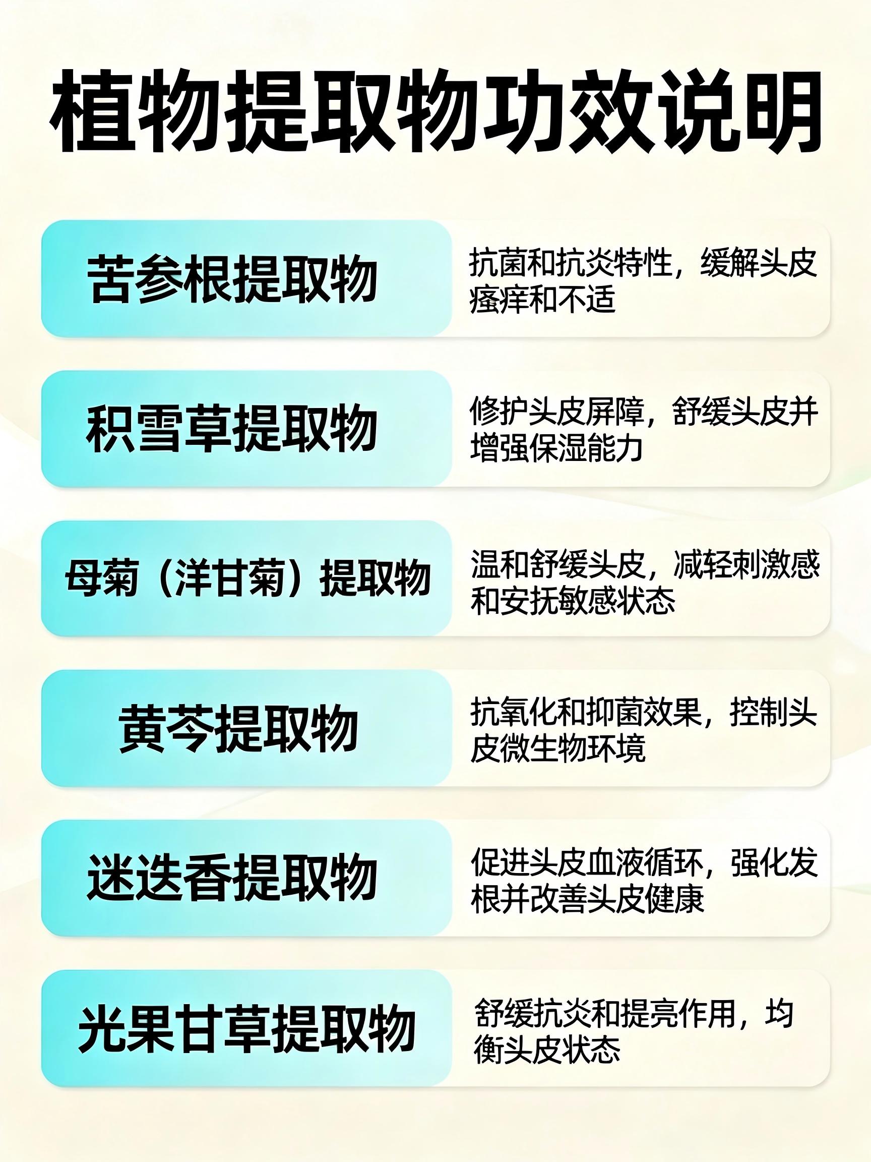舒缓修复组:积雪草提取物促进头皮胶原蛋白生成,修护因抓挠受损的组织;母菊(洋甘菊)提取物富含黄酮类成分,是抗炎舒缓的专家;虎耳草提取物则擅长清热抗炎,缓解头皮的灼热感。