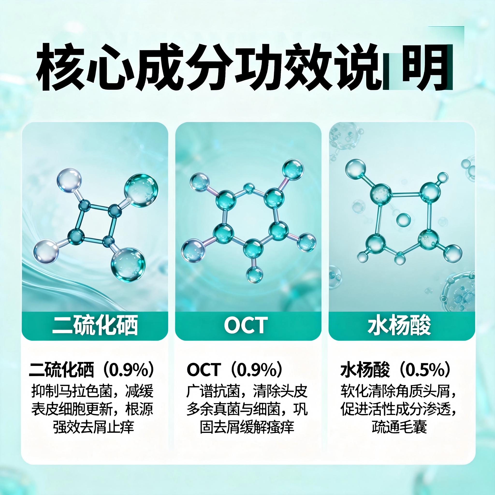 1. 核心去屑止痒协同:0.9%二硫化硒+0.9%OCT+0.5%水杨酸2.0(三重协同,根源断屑)