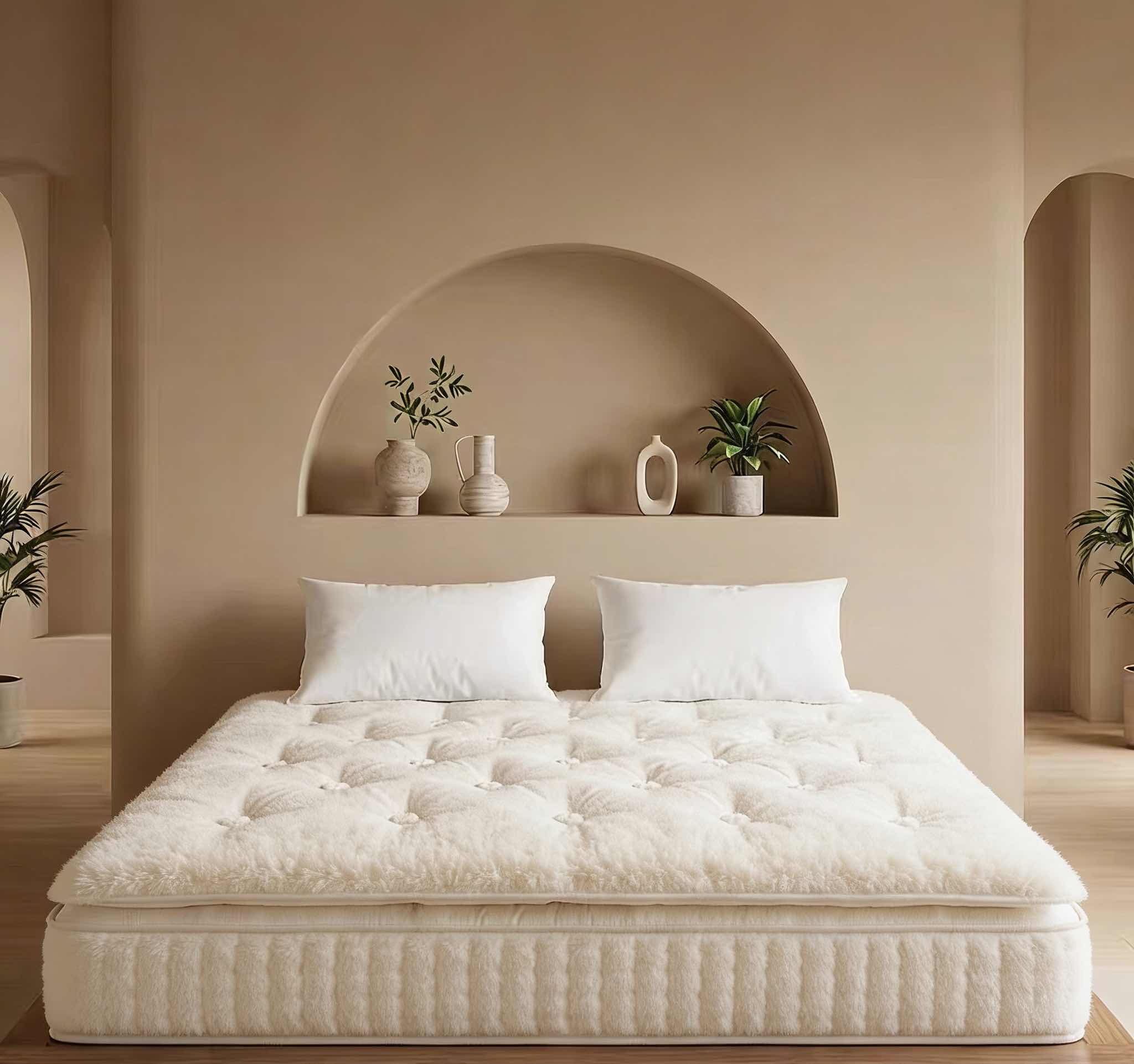 核心材质:面料(天丝梭织面料)、填充层(羊绒 + 驼绒 + 卷绒黑马尾毛)、支撑层(独立静音袋装弹簧)