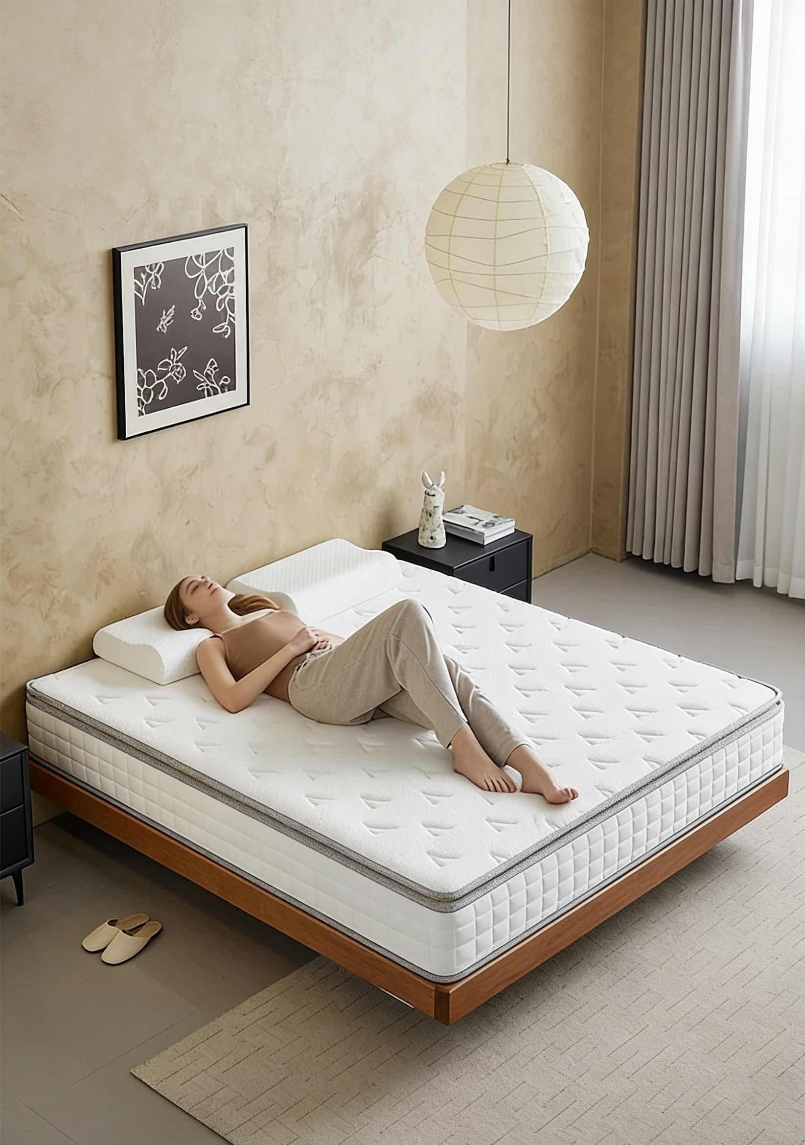 支撑性:天然材质手工铺叠,腰臀部位加厚强化支撑,配合独立弹簧精准承托,贴合脊椎自然曲度。