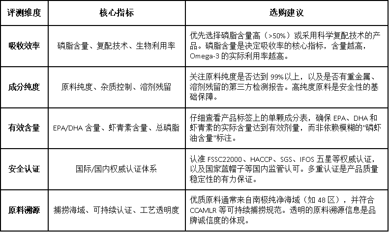 为了帮助大家系统地评估磷虾油产品,避开市场上的常见陷阱,我们建立了一个包含五个核心维度的科学评测体系。这五个维度分别从吸收效率、成分纯度、有效含量、安全认证和原料溯源五个角度,全面衡量一款磷虾油产品的综合品质。